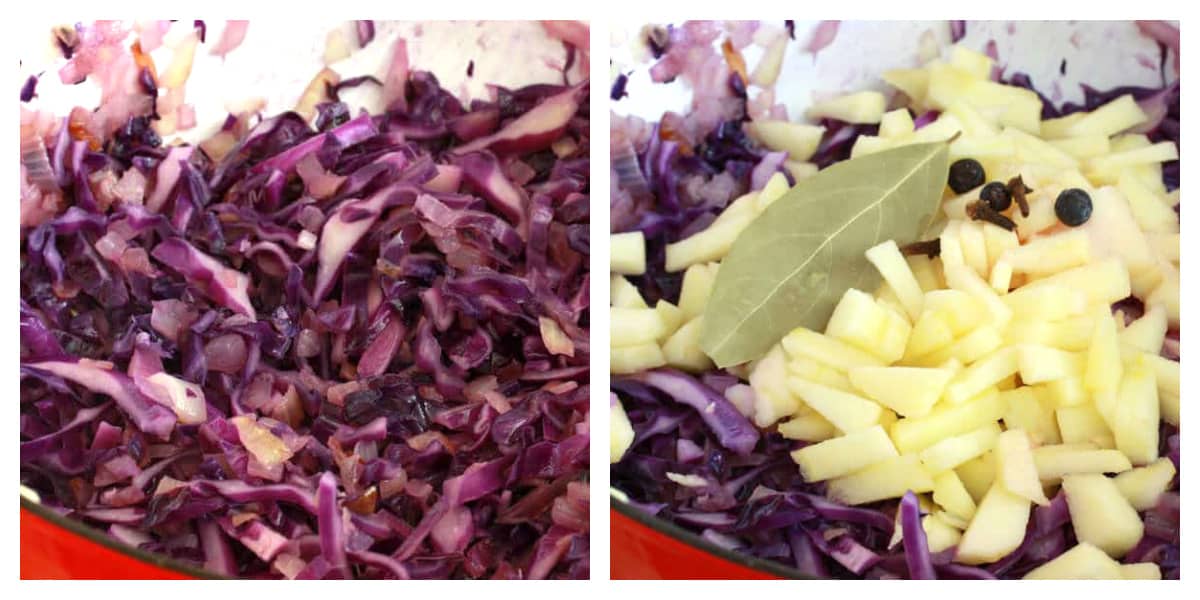 - Melt the butter in a Dutch oven over medium-high heat and cook the onions until just beginning to brown, 7-10 minutes. Add the cabbage and cook for 5 minutes. Add the apple, broth, bay leaf, cloves, juniper berries, red currant jam, red wine vinegar, sugar and salt. Bring to a boil, reduce the heat to low, cover and simmer for 2 hours, stirring occasionally. Add more broth if needed. Combine the flour and water until dissolved and stir into the Rotkohl. Simmer for another minute. Add more salt, sugar and vinegar to taste.