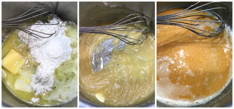 Whisk continuously with a wire whisk until the color of the roux is light to