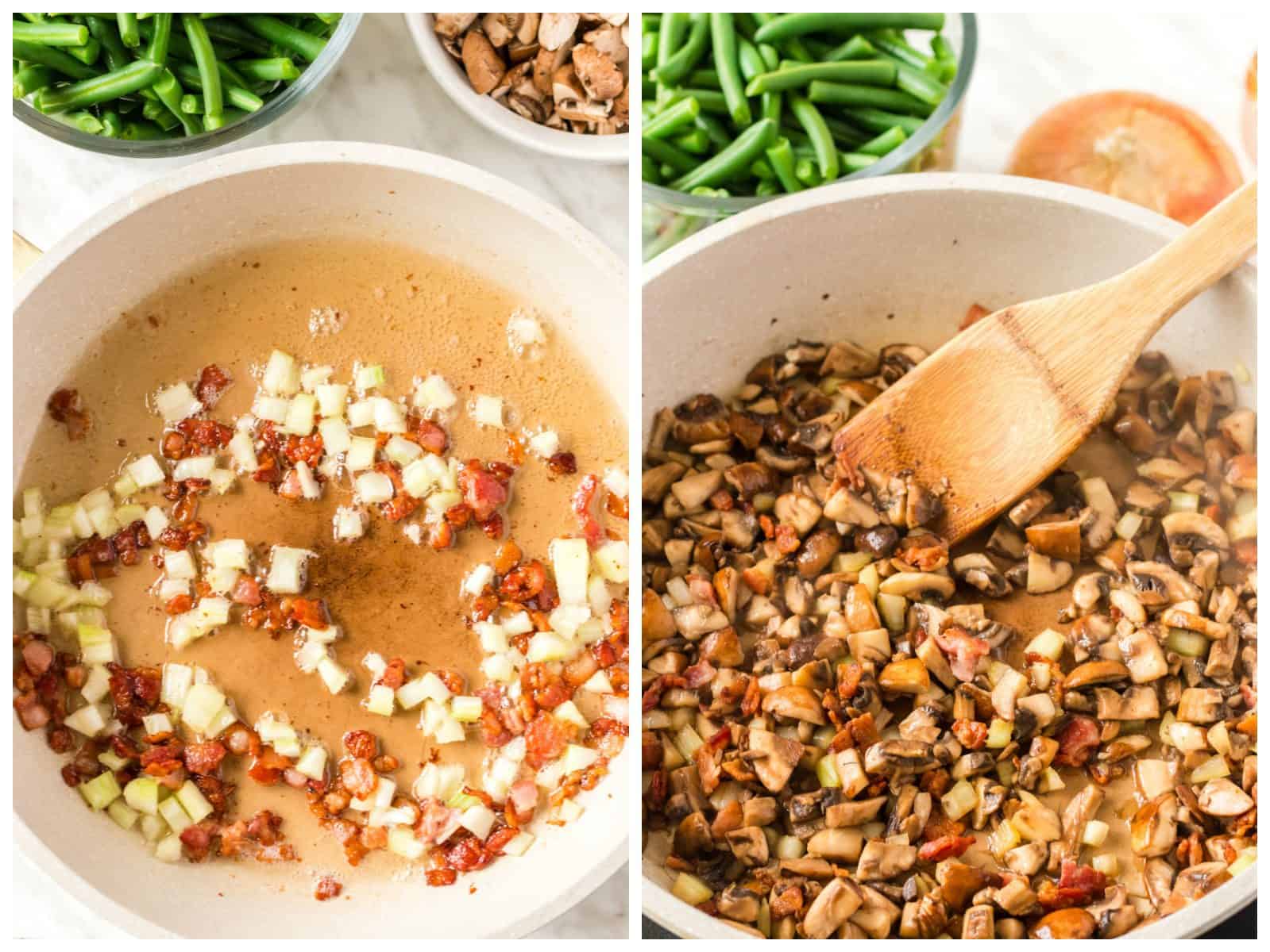 - Fry the bacon in a large skillet over medium-high heat until crispy. Add the onions and cook until soft and translucent, about 4-5 minutes. Add the mushrooms and garlic and cook for another 4-5 minutes until the mushrooms are soft. Transfer the mixture to a bowl.