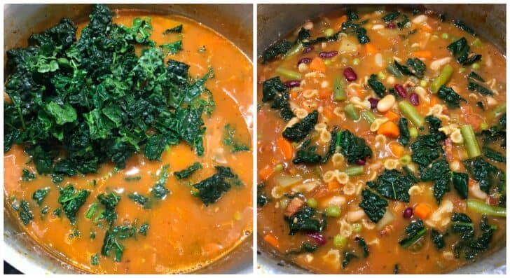 - Add the pasta and simmer, covered, for another 10 minutes. Add the kale and simmer for another 3-5 minutes. Add salt and pepper to taste.