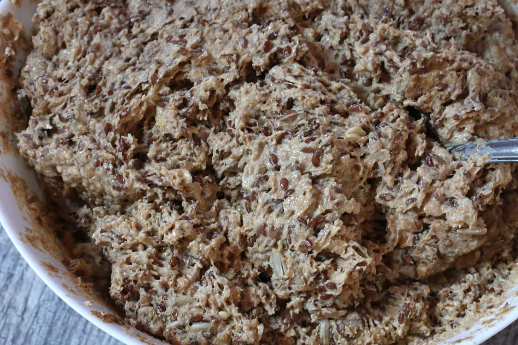 Scoop the mixture into a non-reactive bowl, cover loosely with plastic wrap and let it sit at room temperature for at least 8 hours, preferably longer, up to 24 hours (the longer the better for the whole grain berries to soften and for heightened sourdough properties. If you’re letting it sit for less than 24 hours, presoak the grains overnight in advance and drain thoroughly). Also, the longer it ferments the more liquid will be absorbed so less chances of a moist center after baking.