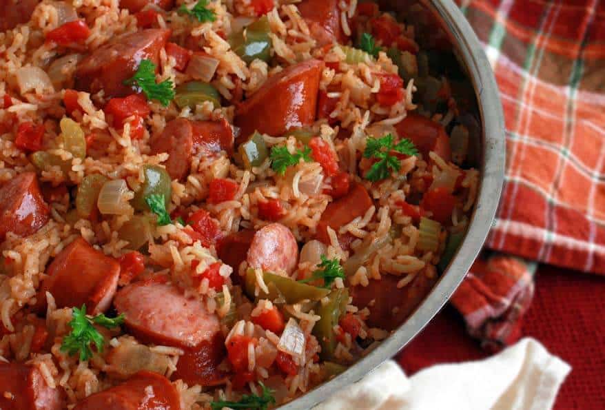 - Melt the butter over medium-high heat and saute the onions, bell peppers, celery and garlic for about 7 minutes. Add the tomatoes and their juice, Creole seasoning, salt, and hot sauce if using. Stir to combine.Add the kielbasa, rice, chicken broth, bay leaf and stir to combine. Bring to a boil, reduce the heat to low, cover and cook for 25 minutes or until the rice is tender.(Try to avoid removing the lid while it's cooking) Remove from heat and let it sit, covered, for 5 minutes. Then fluff the rice with a fork. Serve immediately.