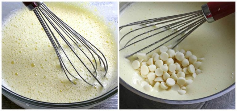 - In a medium sauce pan over medium-high heat, heat the milk with the salt until it reaches just before the boiling point. Bubbles will have formed on the surface. Do not let it boil.Whisk about a cup of the hot milk into the egg yolk/sugar mixture and whisk continually until incorporated and smooth. Whisk this mixture back into the pot and whisk continually until combined.Bring the custard to a low simmer, whisking continually, until thickened enough to coat the back of a wooden spoon. Stir in the white chocolate and continue stirring until melted.