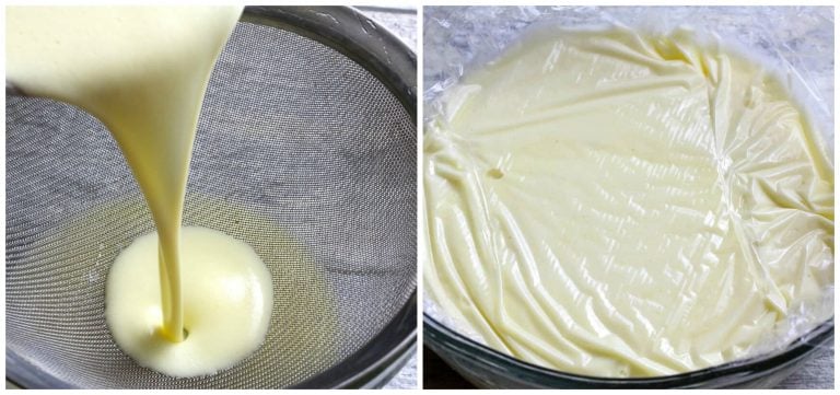 - Pour the custard through a fine mesh sieve into a bowl and cover the bowl with plastic wrap, pressing down onto the surface of the custard to prevent a hard layer from forming on top. Chill in the fridge overnight.